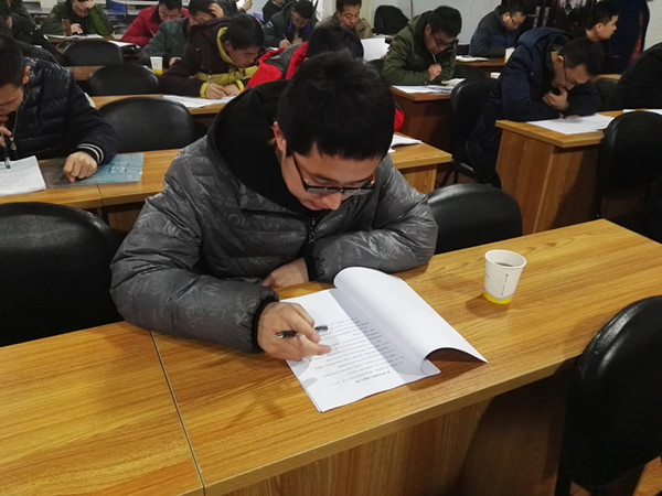 上午九點競賽正式開始。參賽人員拿到題后,細心瀏覽并作答,現(xiàn)場答題氛圍安靜嚴肅。據(jù)悉,此次競賽題目分為兩類,分別是土建和安裝專業(yè),由施工方案競賽評選領(lǐng)導(dǎo)小組出題。通過對現(xiàn)場答題職工的采訪,他們認為此次競賽的題量適中,題目有深度,雖然按照書本知識能夠答完,但是要結(jié)合安全文明施工、綠色施工、優(yōu)質(zhì)結(jié)構(gòu)和新技術(shù)示范創(chuàng)建等要求,答題標準就必須提升檔次,不再局限于答完,更要求答好、答精。公司也據(jù)此為參賽人員留夠充足的答題時間,讓他們認真思考,耐心作答。